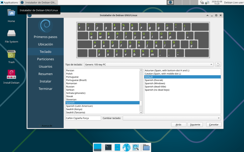 Aquí se define cómo el sistema interpreta las pulsaciones físicas del teclado. Configura la distribución del teclado y su variante regional. Guarda la configuración y continúa al particionado.