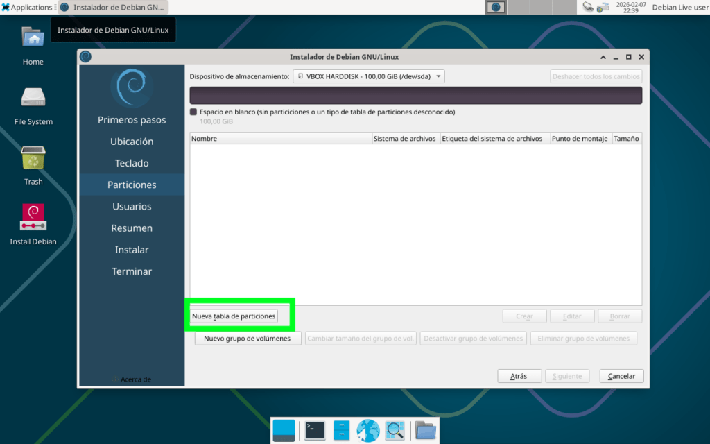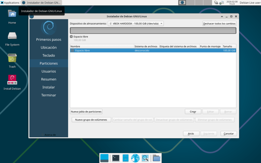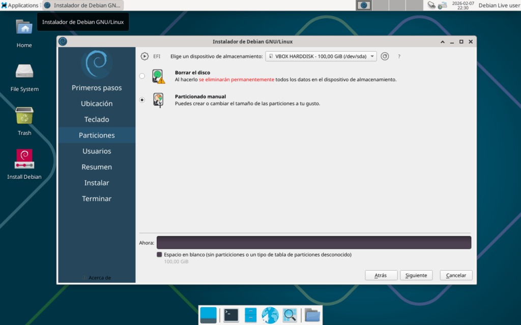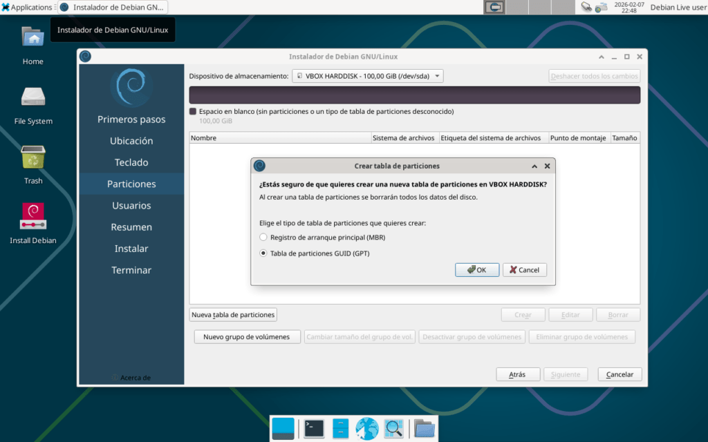 Lista el disco donde se instalará Debian (ejemplo: VBOX HARDDISK – 100 GiB (/dev/sda)).