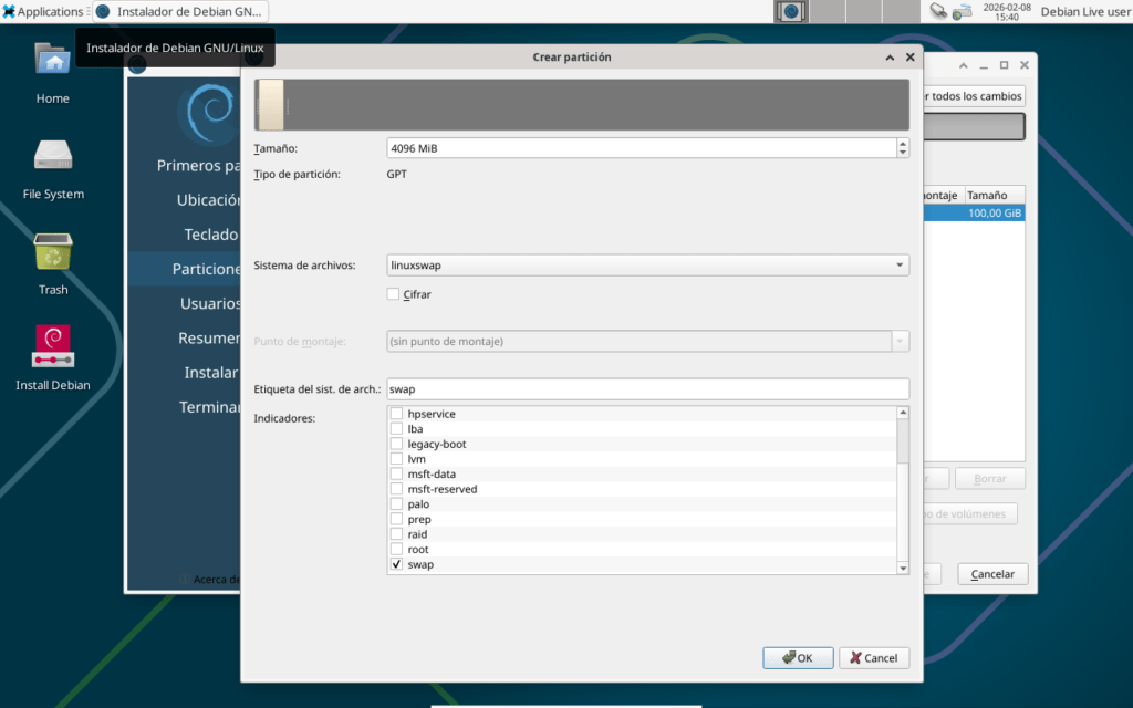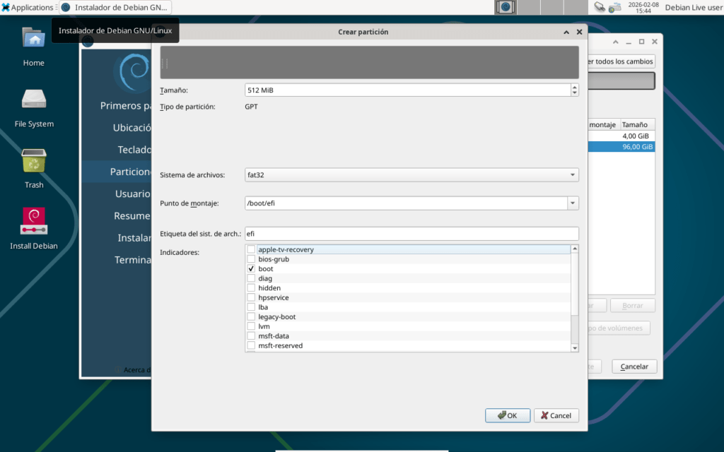 Para crear la primera partición EFI en esta pantalla del instalador Calamares de Debian 13, estas son las opciones clave y su función técnica, explicado al grano: