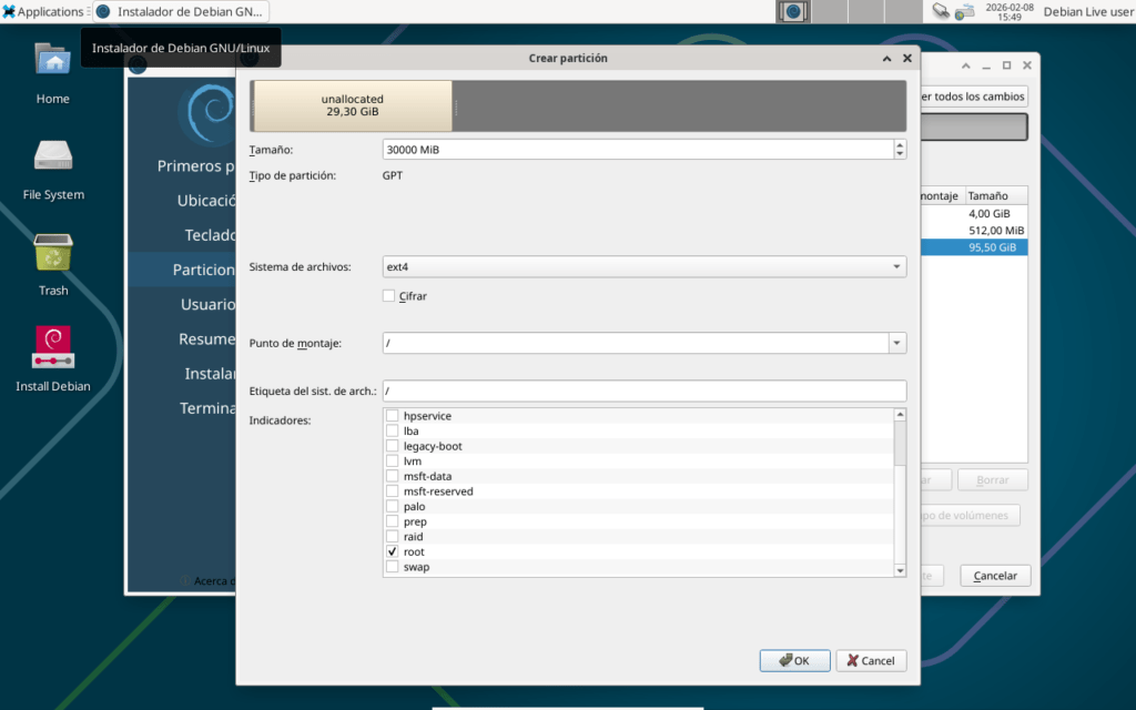 Para crear la primera partición raíz (/) en esta pantalla del instalador Calamares de Debian 13, estas son las opciones clave y su función técnica, explicado breve y al grano: