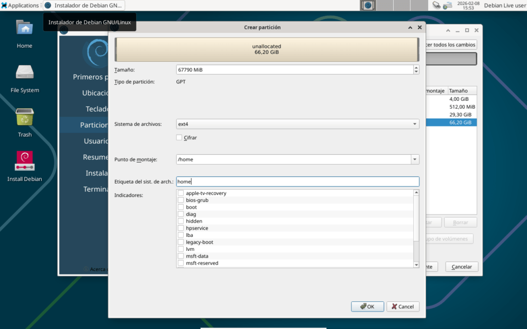 Para crear la partición /home en esta pantalla del instalador Calamares de Debian 13, estas son las opciones clave y su función técnica, explicado breve y al grano: