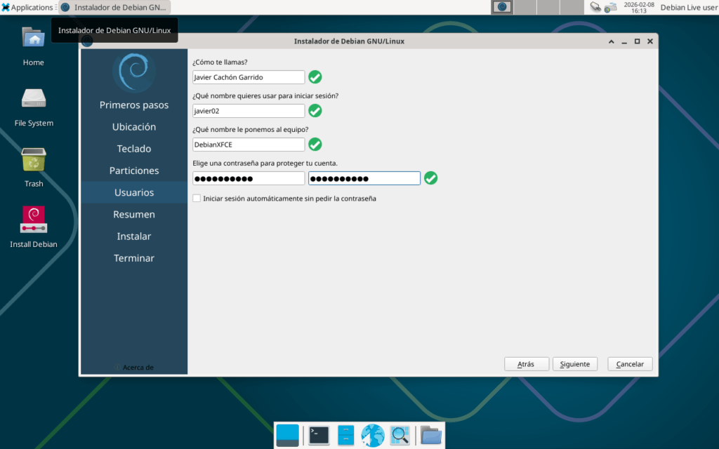 En esta pantalla del instalador Calamares de Debian 13 estás en la fase Usuarios, donde se crea la cuenta principal del sistema. Descripción breve y técnica de cada campo: