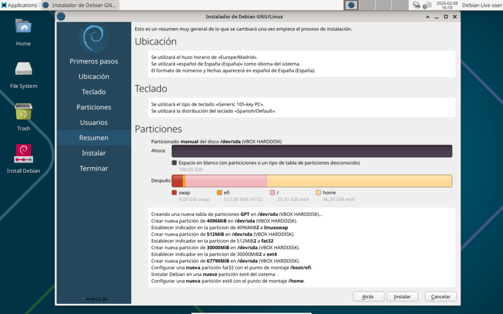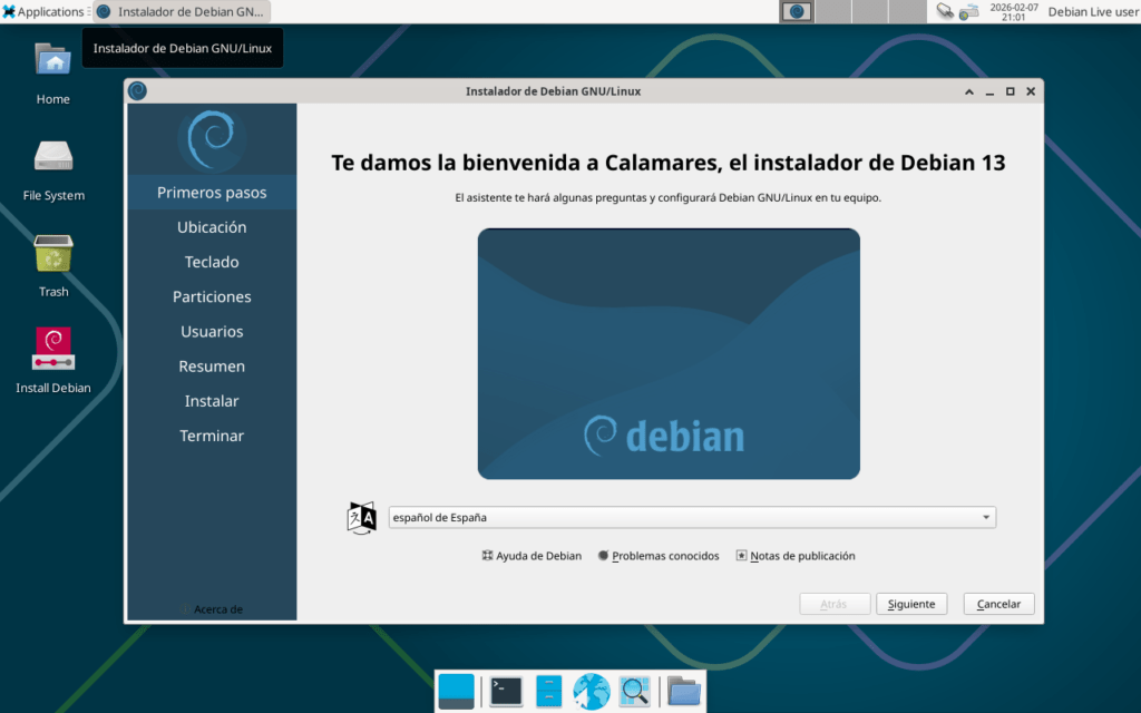 Por su parte, Calamares es un instalador gráfico modular y multiplataforma que utilizan numerosas distribuciones modernas. A diferencia del instalador clásico de Debian, Calamares presenta una interfaz visual secuencial y didáctica: selección de idioma, zona horaria, teclado, particionado de discos, creación de usuarios y despliegue final del sistema. Aunque simplifica la experiencia, no oculta la complejidad real del proceso, lo que lo convierte en una herramienta excelente para aprender cómo se estructura un sistema Linux desde su base: particiones, puntos de montaje, cargador de arranque (bootloader) y configuración inicial.