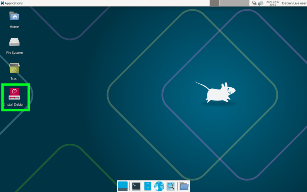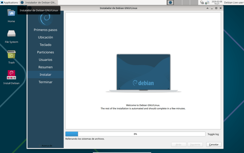 Este escritorio confirma que ya estás dentro del entorno Live funcional: el sistema está completamente operativo en RAM y listo tanto para pruebas como para iniciar la instalación definitiva desde el icono Install Debian.