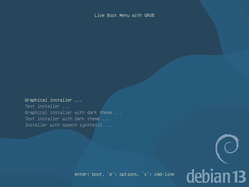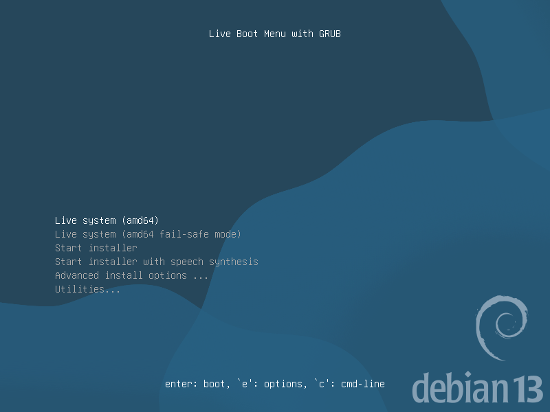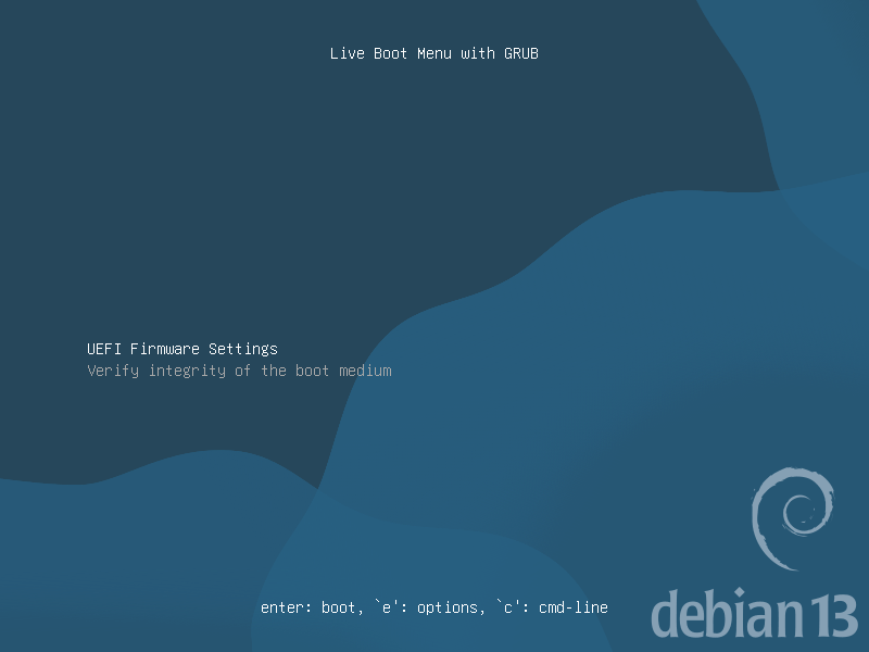 Menú de arranque Live gestionado por GRUB en Debian 13