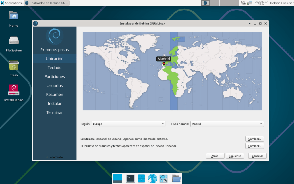 Aquí se configuran parámetros regionales y de tiempo que afectan al funcionamiento interno del sistema. región geográfica, país, zona horaria. Confirma esta configuración y avanza al siguiente paso (teclado).